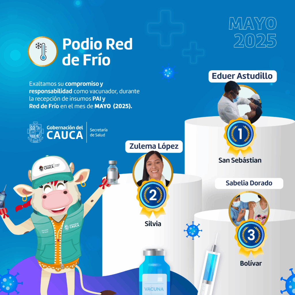 Este mes, el primer lugar fue Eduer Jesús Astudillo del municipio de San Sebastián, seguido por Zulema López del municipio de Silvia y Sabelia Dorado Acosta del municipio de Bolívar, quienes demostraron compromiso excepcional en la conservación y transporte de biológicos del Programa Ampliado de Inmunizaciones (PAI).