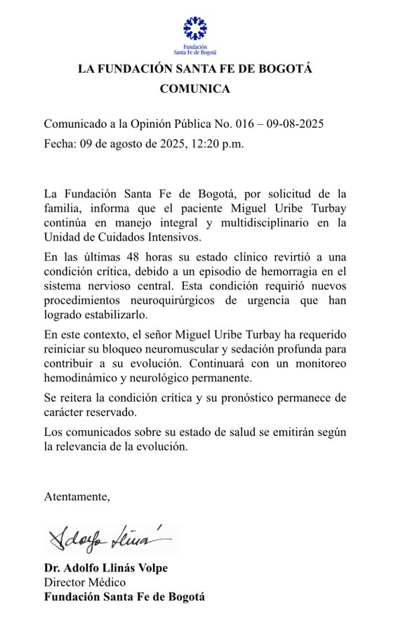 Miguel Uribe Turbay, senador del Centro Democrático y precandidato presidencial, volvió a estado crítico, tras el atentado sufrido el pasado 7 de junio en Bogotá. La Fundación Santa Fe, donde es atendido, emitió un nuevo comunicado señalando que en las últimas 48 horas tuvo una hemorragia en el sistema nervioso central.