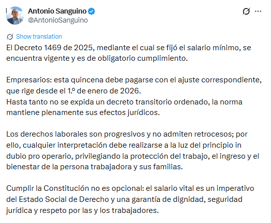 “Por instrucción del presidente Gustavo Petro, he convocado este lunes 16 de febrero a las 10 am en el Ministerio de Trabajo a la Comisión de Concertación de Políticas Salariales y Laborales para discutir sobre el decreto transitorio de salario mínimo, que debe ser vital y móvil como lo establece el artículo 53 de la Constitución Nacional, ordenado por el auto del Consejo de Estado”, anunció el jefe de la cartera de Trabajo a través de su cuenta de X.