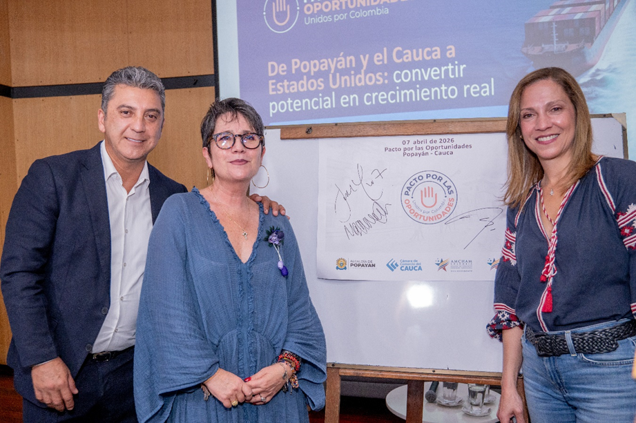 La Alcaldía de Popayán, liderada por el alcalde Juan Carlos Muñoz Bravo, acompañó el foro ‘Cauca en Perspectiva: Economía, Empresa y Competitividad’, escenario en el que se llevó a cabo la firma del Pacto por las Oportunidades – Unidos por Colombia, suscrito entre la Cámara Colombo Americana (AmCham Colombia), la Cámara de Comercio del Cauca y la Alcaldía de Popayán. Esta firma tiene como propósito impulsar el crecimiento económico, fortalecer el tejido empresarial y promover la generación de empleo en el territorio.
