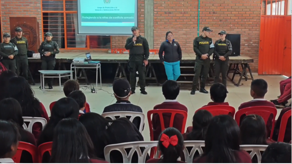 La Policía Nacional, a través del Departamento de Policía Cauca, en articulación con la Comisaría de Familia y la Institución Educativa Francisco José de Caldas, desarrolló actividades de prevención en el municipio de Totoró dirigidas a estudiantes de bachillerato, con el propósito de contrarrestar el reclutamiento ilícito de niños, niñas y adolescentes.