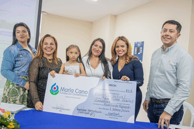 En las instalaciones de la Fundación Universitaria María Cano, se realizó la entrega de una beca universitaria del 100% a...